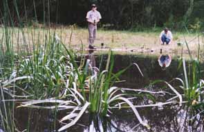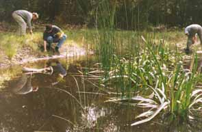 Reshaping old dam to provide gently sloping edges and a variety of depths. |